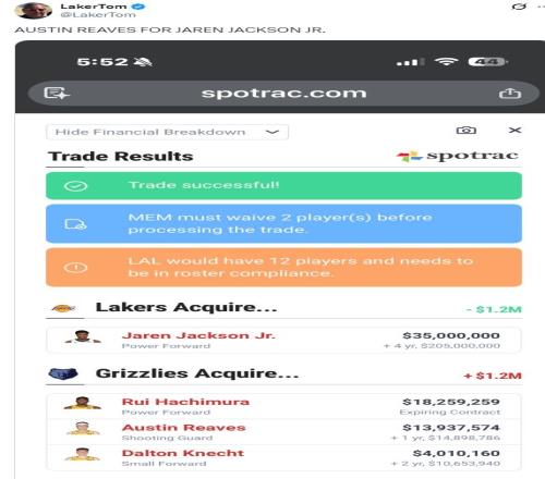 湖媒laker Tom还模拟了一套交易得到小贾伦的方案,他建议用八村垒、里夫斯、克内克特去换小贾伦-杰克逊,而且在这笔交易中湖人并没有送出首轮签。